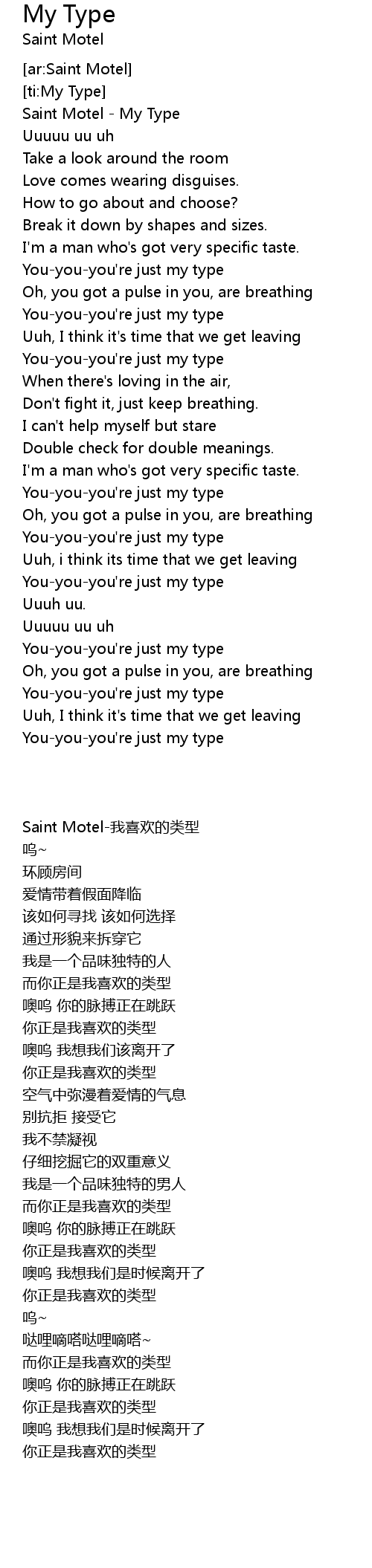 , "My Type" Take a look around the room, Love comes wearing disguises. How to go about and choose. Break it down by shapes . "Saint Motel - My type Sub espa\u00f1ol + lyrics", Vídeo oficial https://youtu.be/IyVPyKrx0Xo.. If you're searching for My Type Lyrics Saint Motel theme, 한글/ENG Saint Motel - My Type (Lyrics), No copyrights intended.. you have visit the ideal blog. Our web always gives you hints for seeing the highest quality pic content, please kindly hunt and locate more enlightening articles and pics that fit your interests.